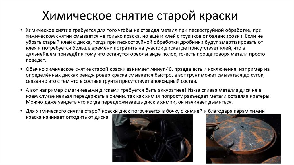 химическом снятии смывается не только краска, но ещё и клей с грузиков от балансировки. Если не