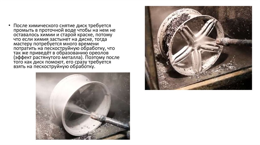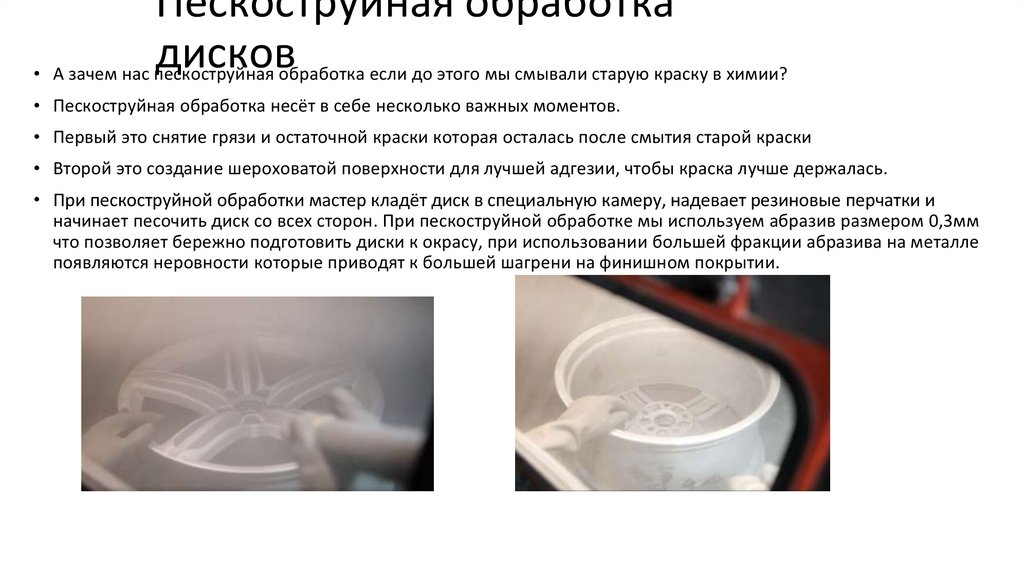 • При пескоструйной обработки мастер кладёт диск в специальную камеру, надевает резиновые перчатки и