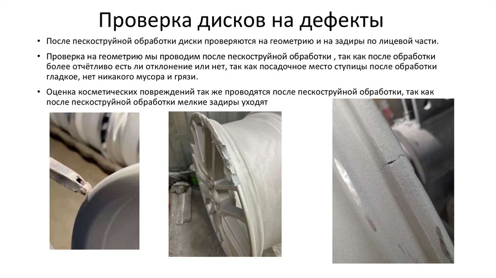 Проверка дисков на дефекты• После пескоструйной обработки диски проверяются на геометрию и на задиры по лицевой части.