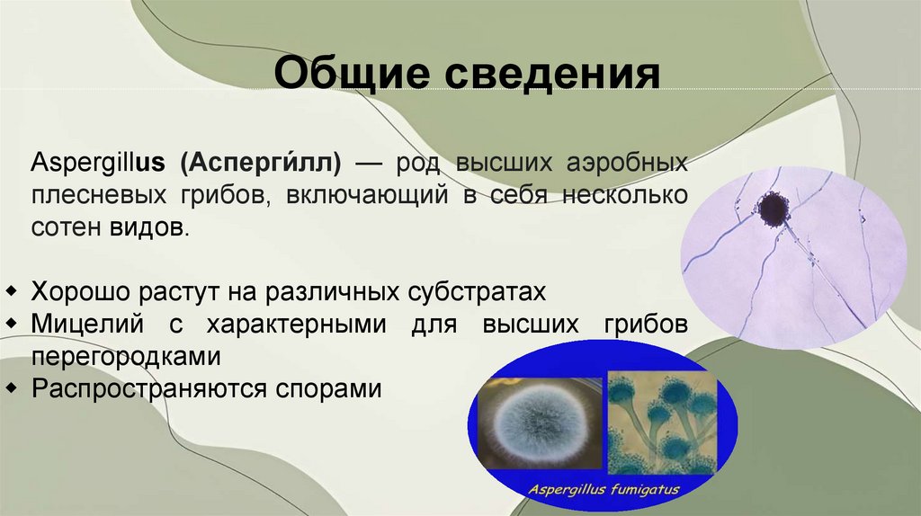 Общие сведенияAspergillus (Асперги́лл) — род высших аэробных