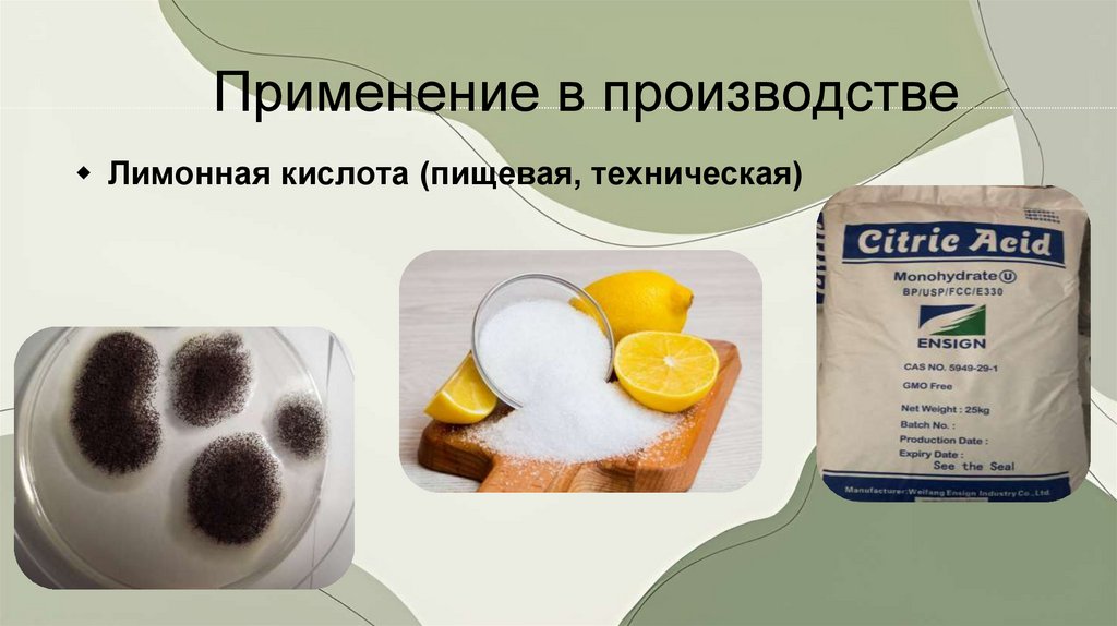 Применение в производствеЛимонная кислота (пищевая, техническая)