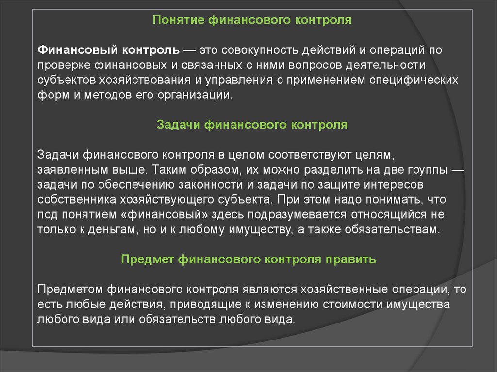 Понятие финансового контроляФинансовый контроль — это совокупность действий и операций по