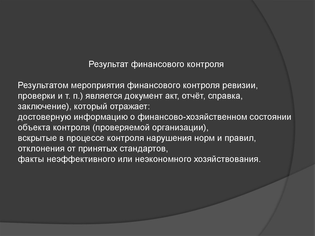 Результат финансового контроляРезультатом мероприятия финансового контроля ревизии,