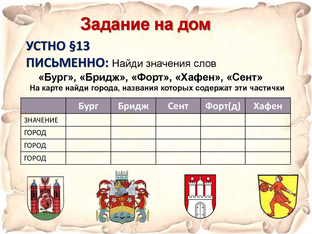 «Бург», «Бридж», «Форт», «Хафен», «Сент»
