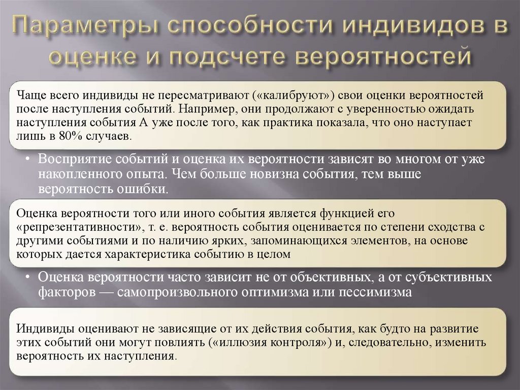 • Восприятие событий и оценка их вероятности зависят во многом от уже