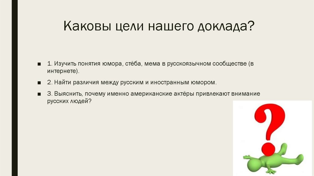 Каковы цели нашего доклада?■ 1. Изучить понятия юмора, стёба, мема в русскоязычном сообществе (в