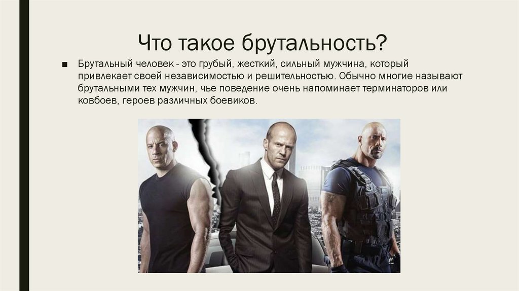 Что такое брутальность?■ Брутальный человек - это грубый, жесткий, сильный мужчина, который