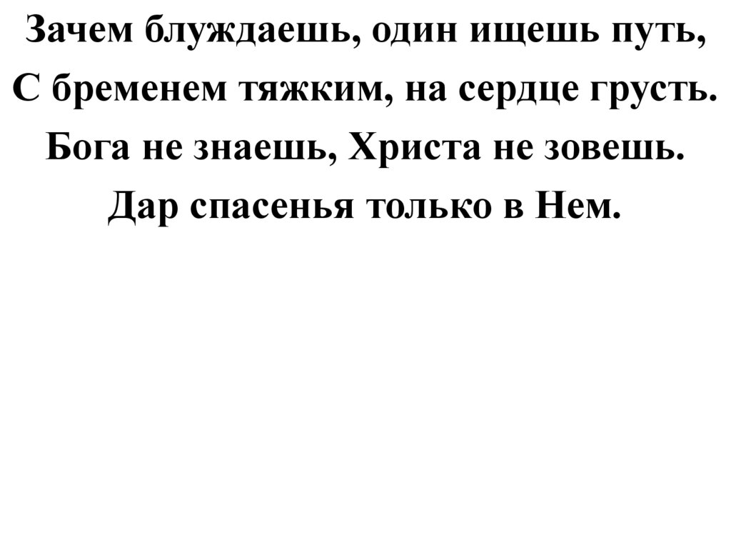 Зачем блуждаешь, один ищешь путь,С бременем тяжким, на сердце грусть.