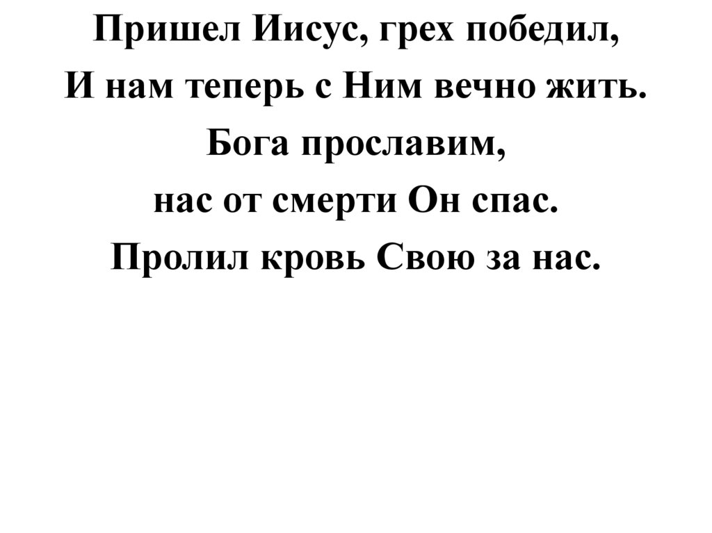 Пришел Иисус, грех победил,И нам теперь с Ним вечно жить.