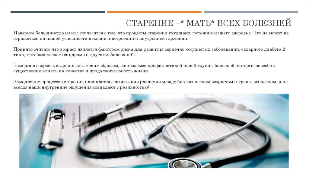 СТАРЕНИЕ –* МАТЬ* ВСЕХ БОЛЕЗНЕЙНаверное большинство из нас согласится с тем, что процессы старения ухудшают состояние нашего здоровья. Что не может не