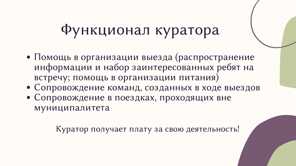 Функционал куратораПомощь в организации выезда (распространение
