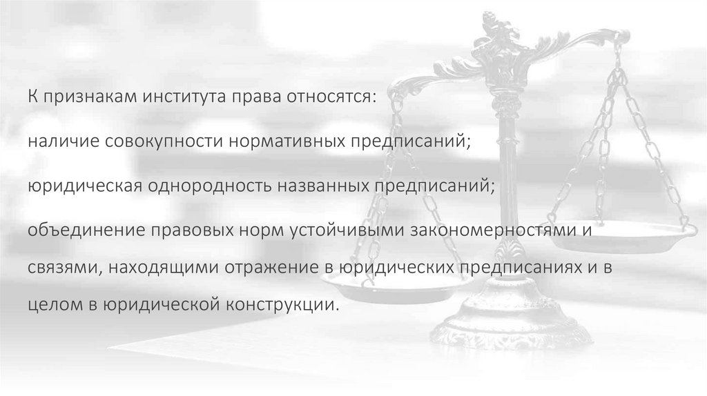 К признакам института права относятся:наличие совокупности нормативных предписаний;