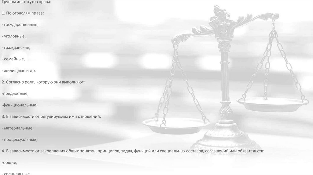 Группы институтов права:1. По отраслям права: