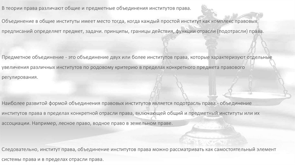 В теории права различают общие и предметные объединения институтов права.Объединение в общие институты имеет место тогда, когда каждый простой институт как комплекс правовых