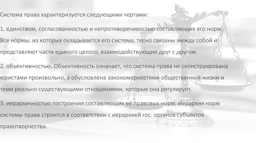 Система права характеризуется следующими чертами:1. единством, согласованностью и непротиворечивостью составляющих его норм.