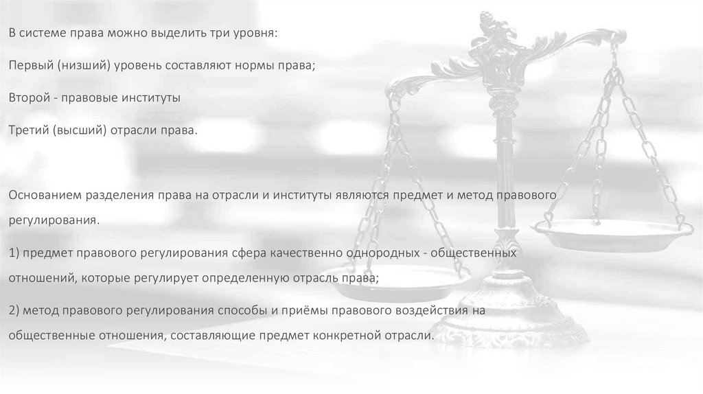 В системе права можно выделить три уровня:Первый (низший) уровень составляют нормы права;
