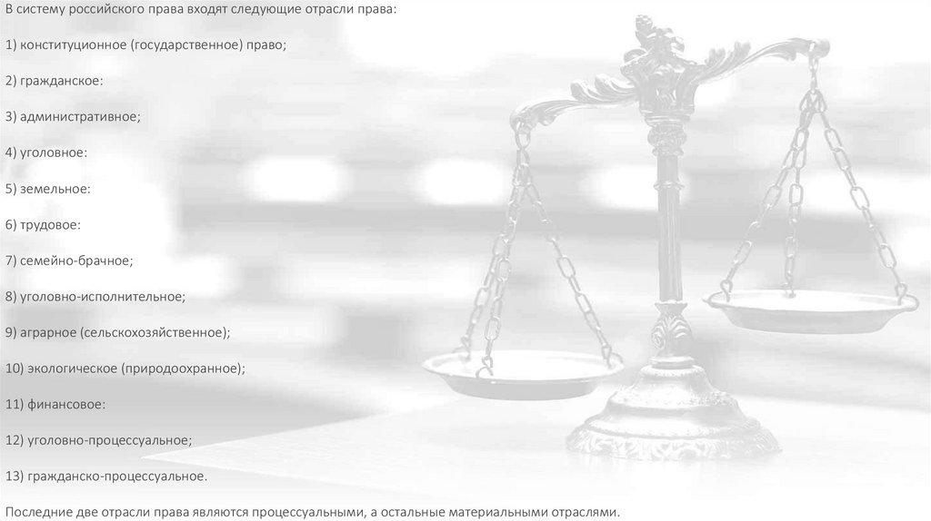 Последние две отрасли права являются процессуальными, а остальные материальными отраслями.
