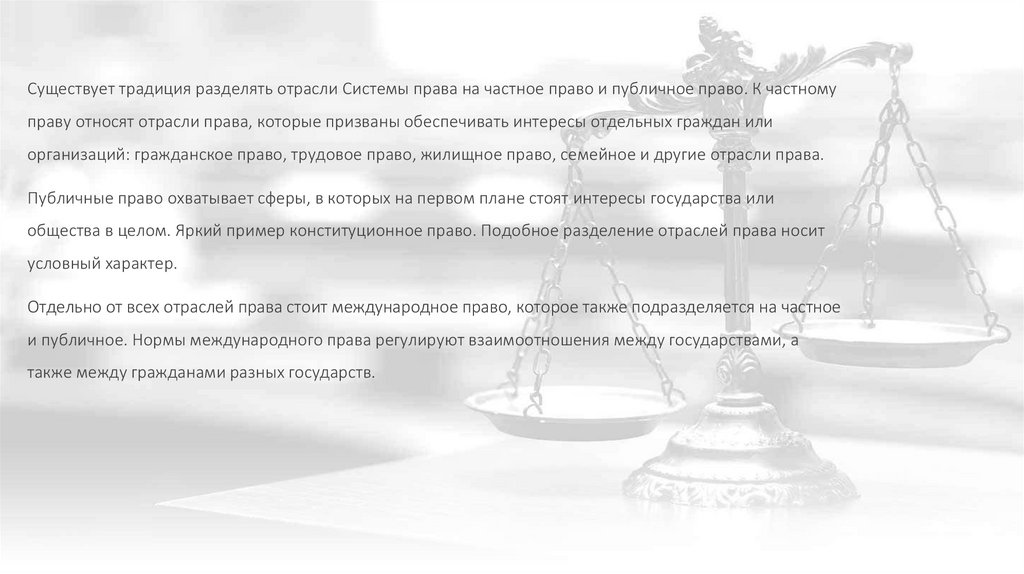 Существует традиция разделять отрасли Системы права на частное право и публичное право. К частномуправу относят отрасли права, которые призваны обеспечивать интересы отдельных граждан или