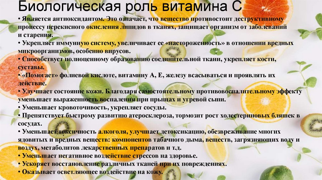 Биологическая роль витамина С• Является антиоксидантом. Это означает, что вещество противостоит деструктивному