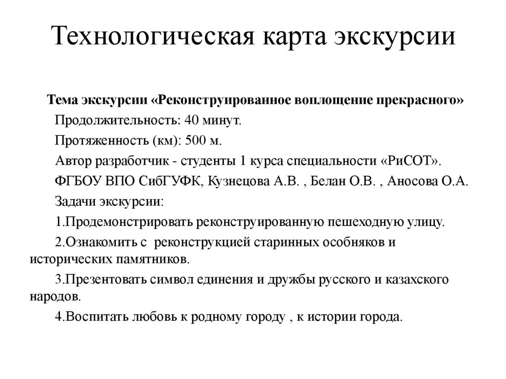Технологическая карта экскурсииТема экскурсии «Реконструированное воплощение прекрасного»