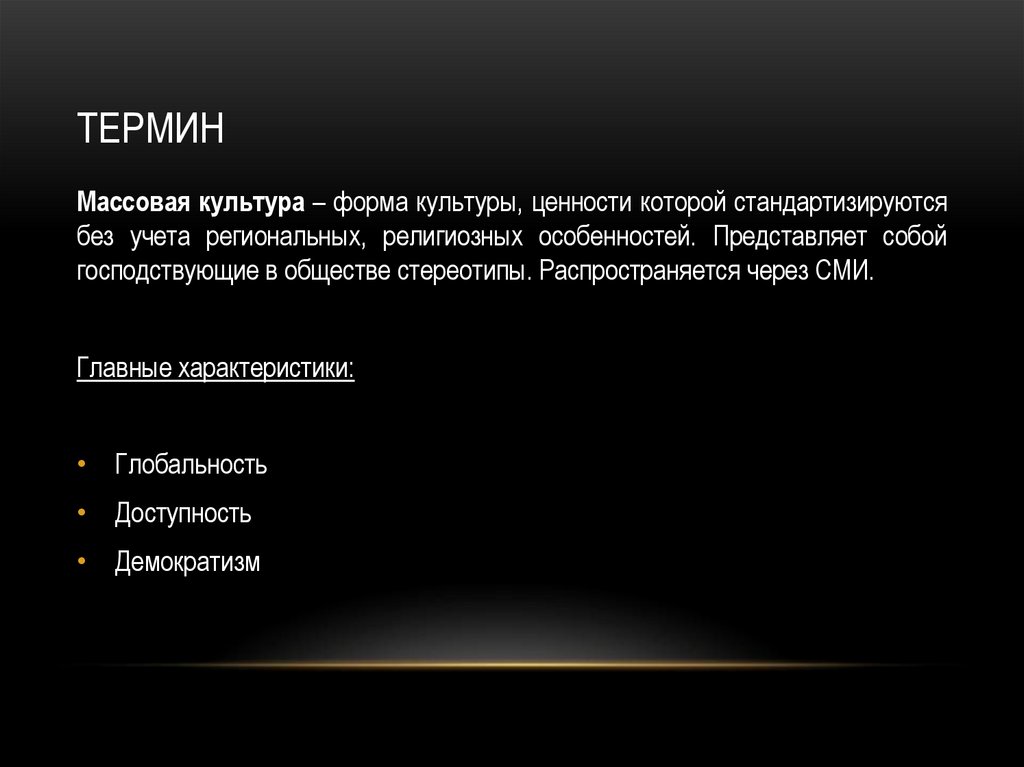 ТЕРМИНМассовая культура – форма культуры, ценности которой стандартизируются