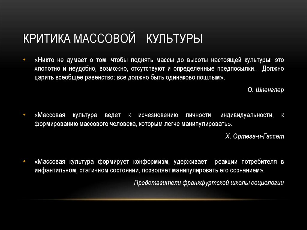 КРИТИКА МАССОВОЙ КУЛЬТУРЫ«Никто не думает о том, чтобы поднять массы до высоты настоящей культуры; это