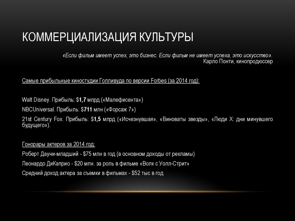 КОММЕРЦИАЛИЗАЦИЯ КУЛЬТУРЫ«Если фильм имеет успех, это бизнес. Если фильм не имеет успеха, это искусство».