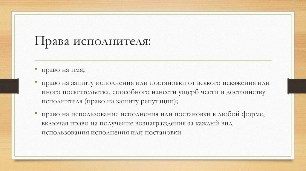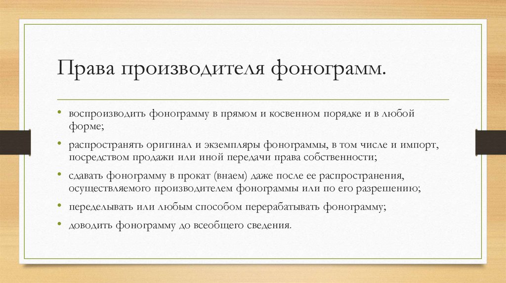 Права производителя фонограмм.• воспроизводить фонограмму в прямом и косвенном порядке и в любой