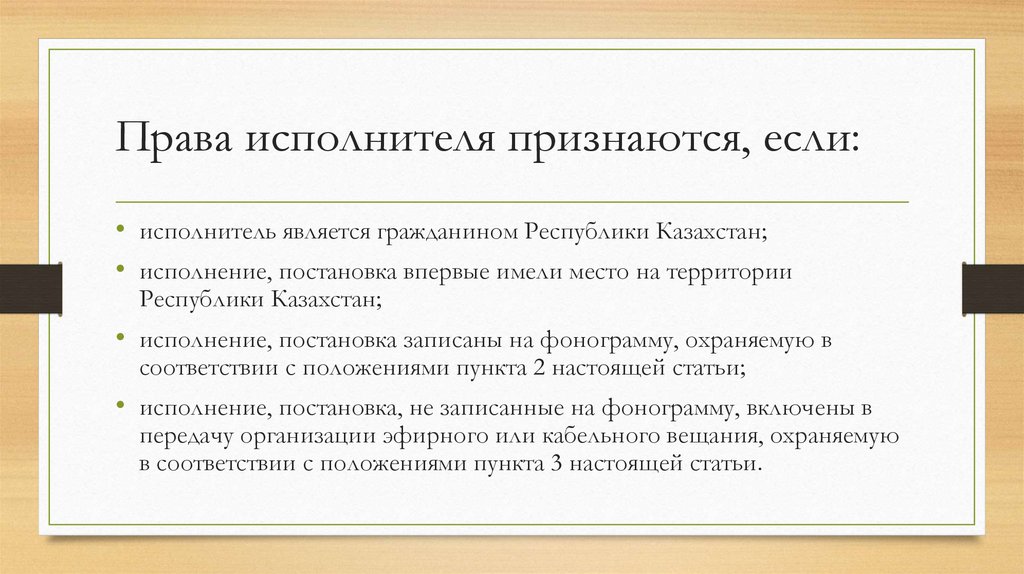 Права исполнителя признаются, если:• исполнитель является гражданином Республики Казахстан;