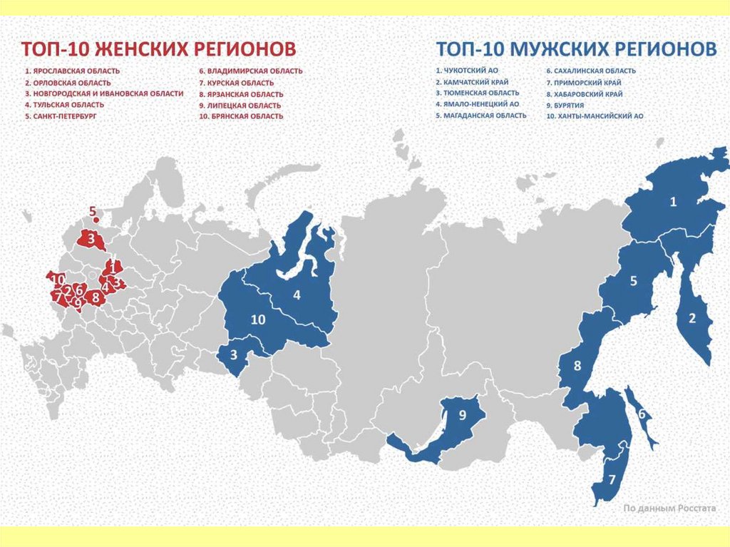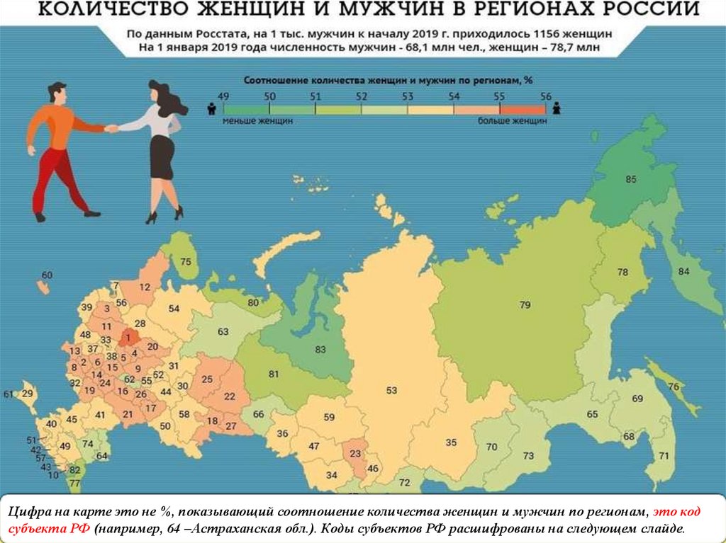 Цифра на карте это не %, показывающий соотношение количества женщин и мужчин по регионам, это кодсубъекта РФ (например, 64 –Астраханская обл.). Коды субъектов РФ расшифрованы на следующем слайде.