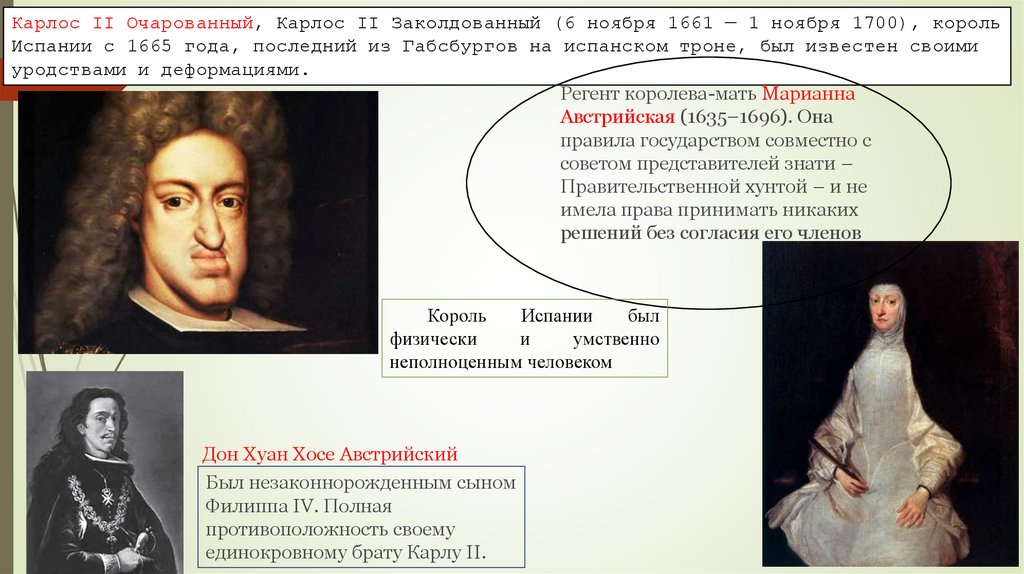 Карлос II Очарованный, Карлос II Заколдованный (6 ноября 1661 — 1 ноября 1700), корольИспании с 1665 года, последний из Габсбургов на испанском троне, был известен своими