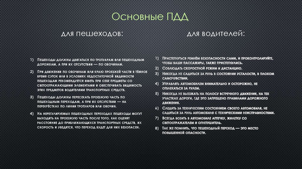 1) ПЕШЕХОДЫ ДОЛЖНЫ ДВИГАТЬСЯ ПО ТРОТУАРАМ ИЛИ ПЕШЕХОДНЫМ