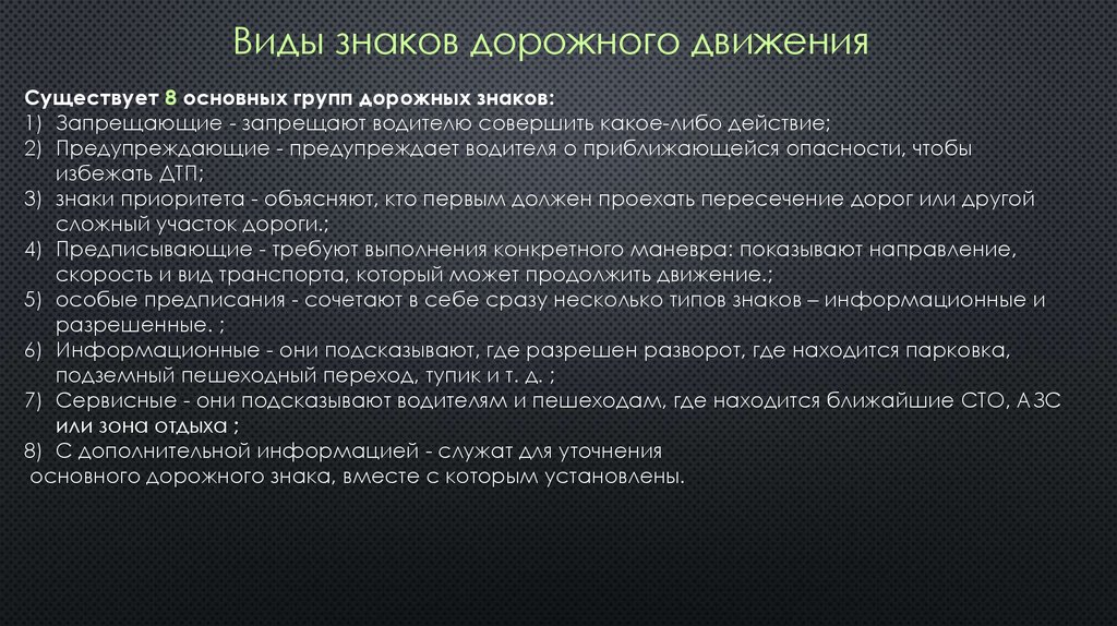Виды знаков дорожного движенияСуществует 8 основных групп дорожных знаков:
