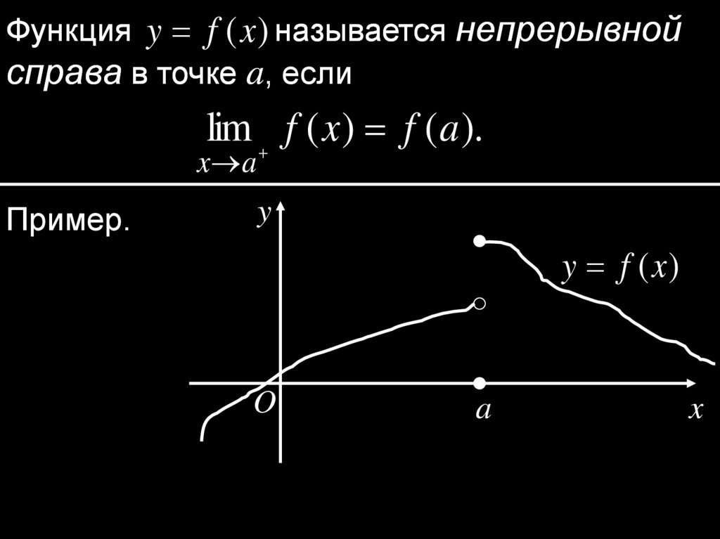 Функция y f (x ) называется непрерывнойсправа в точке a, если