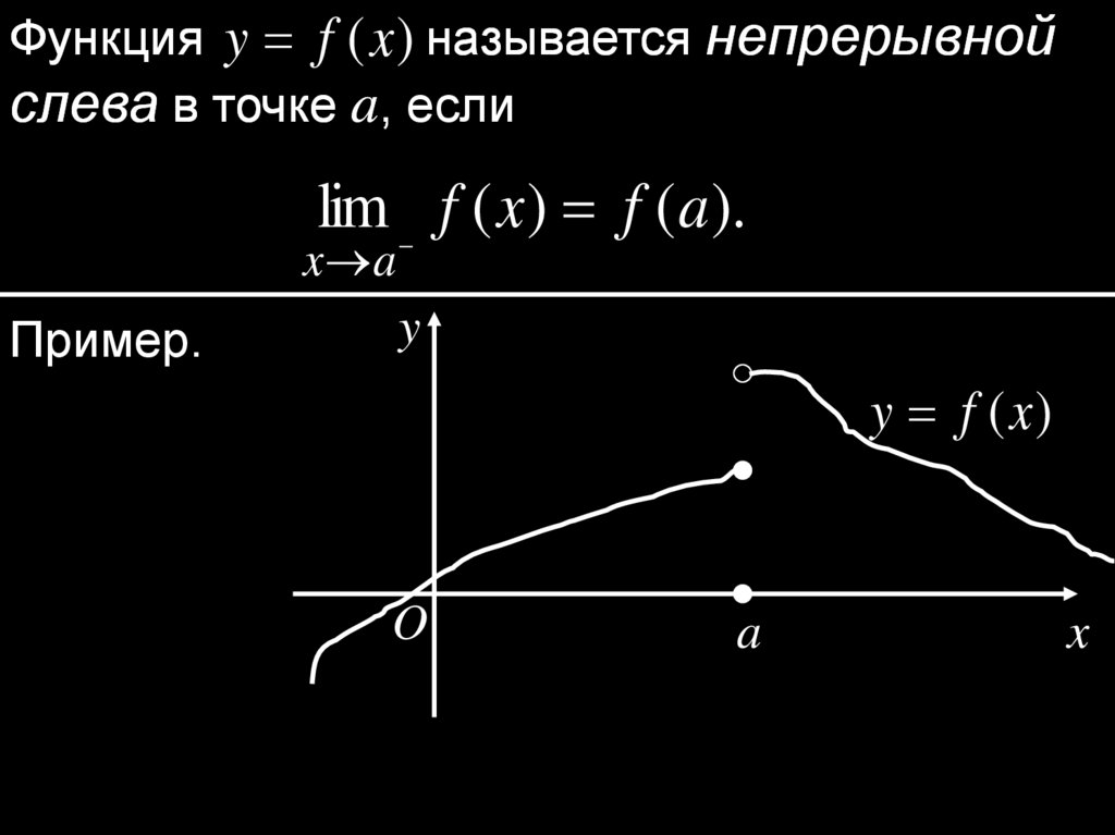 Функция y f (x ) называется непрерывнойслева в точке a, если