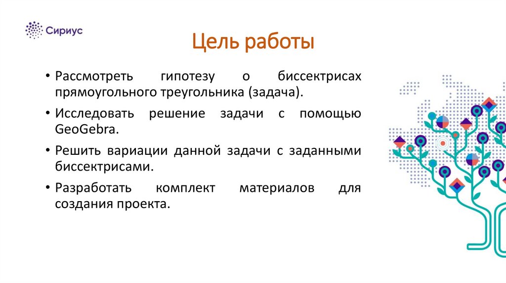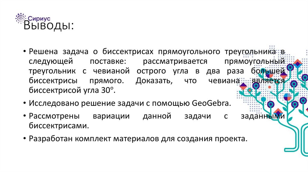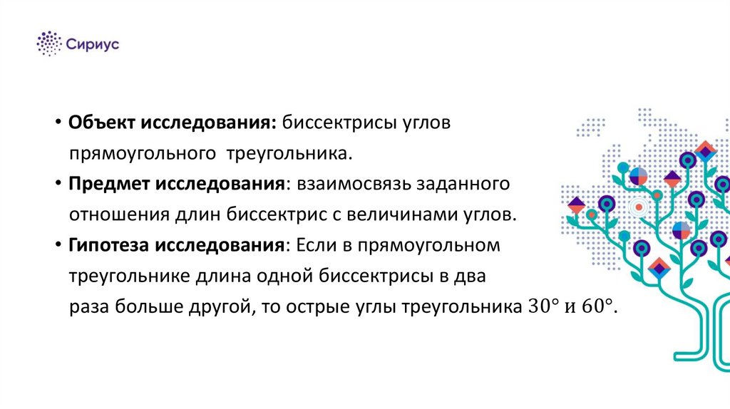 • Объект исследования: биссектрисы угловпрямоугольного треугольника.