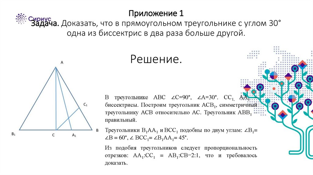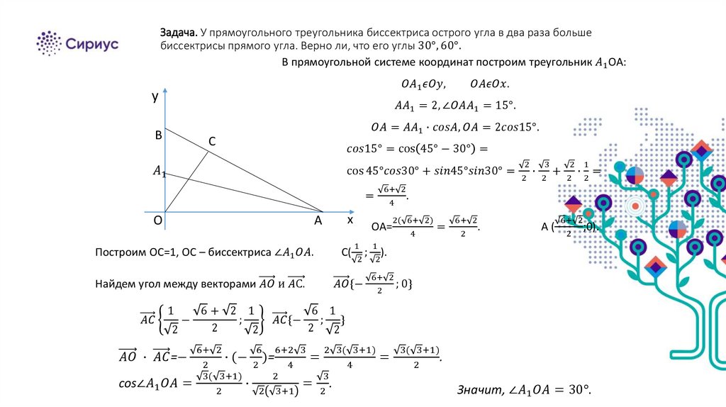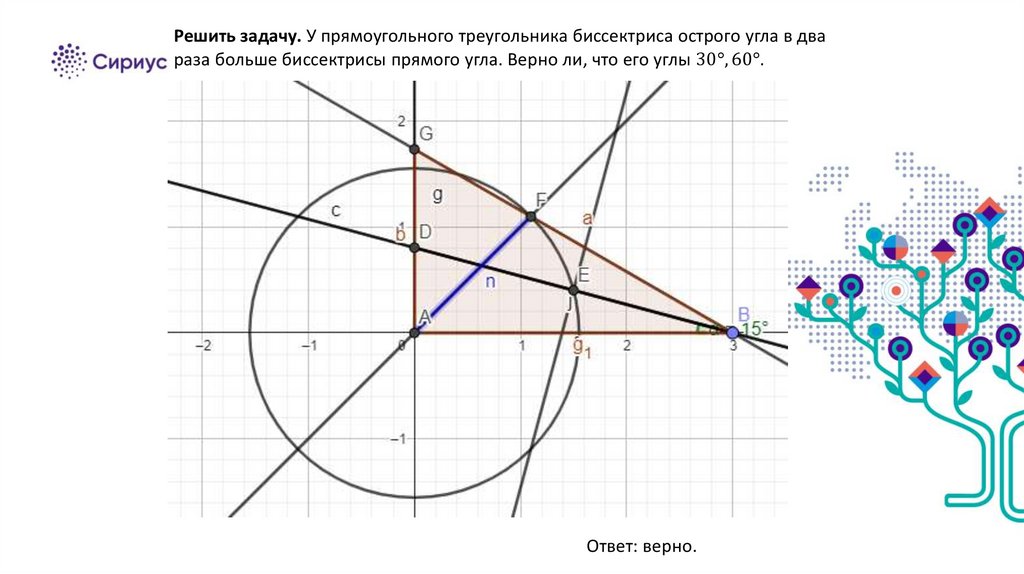 Задача. У прямоугольного треугольника биссектриса острого угла в два раза большебиссектрисы прямого угла. Верно ли, что его углы 30°, 60°.