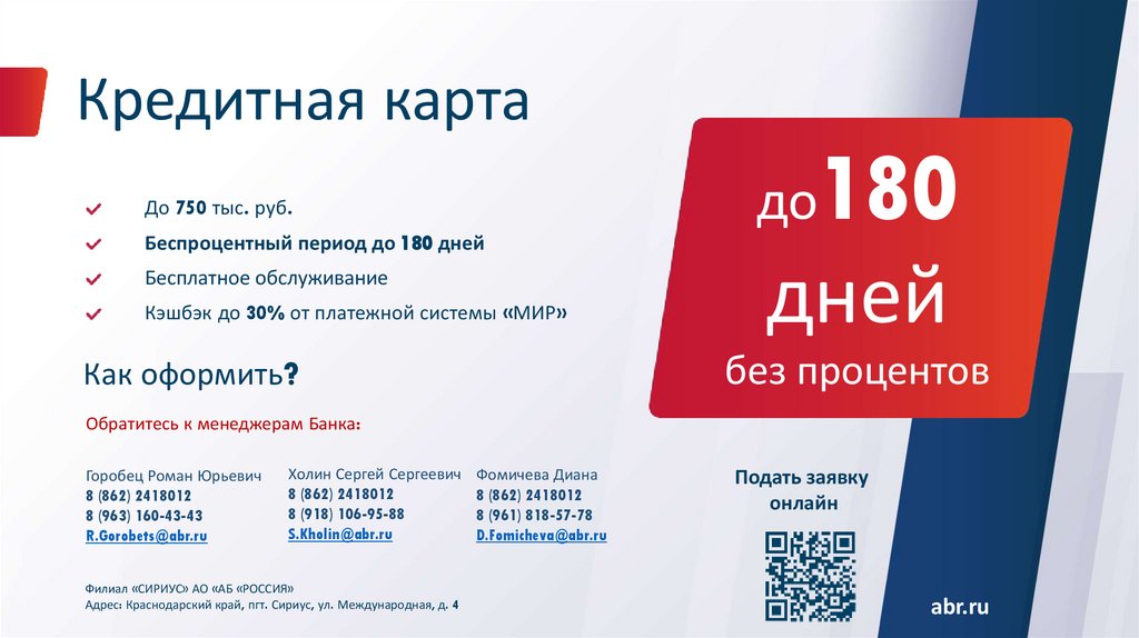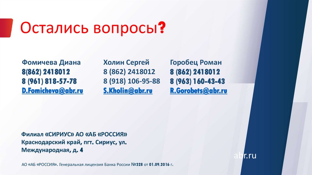 Филиал «СИРИУС» АО «АБ «РОССИЯ» Адрес: Краснодарский край, пгт. Сириус, ул. Международная, д. 4