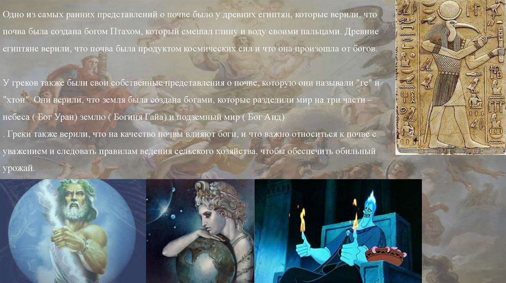 У древних греков и египтян были духовные и религиозные представления о почве, которые, по их мнению,