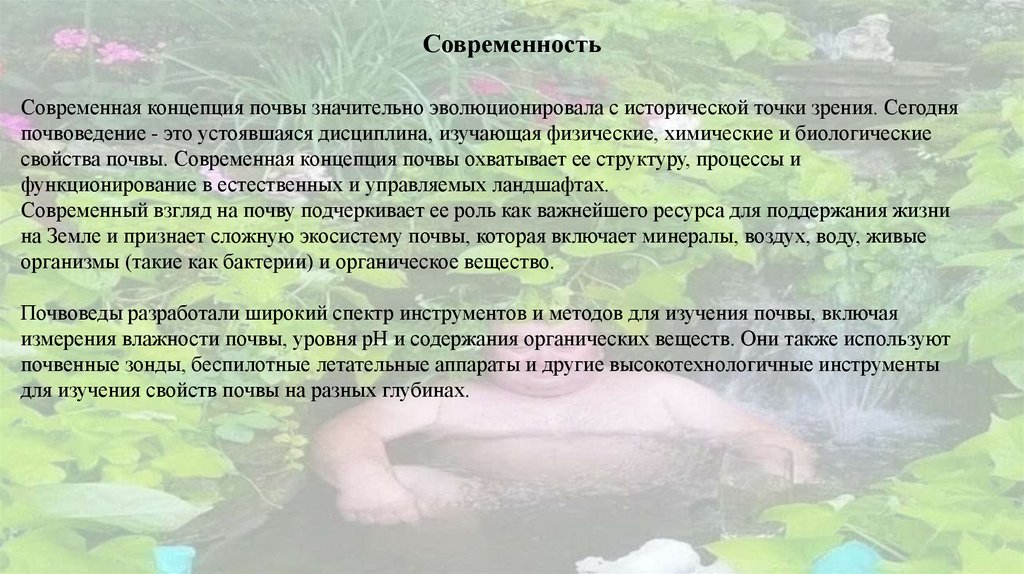 СовременностьСовременная концепция почвы значительно эволюционировала с исторической точки зрения. Сегодня