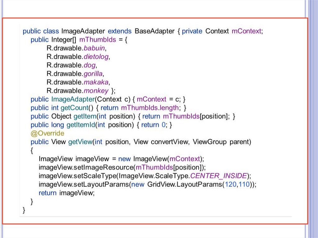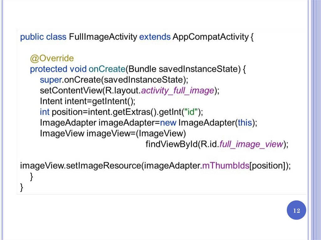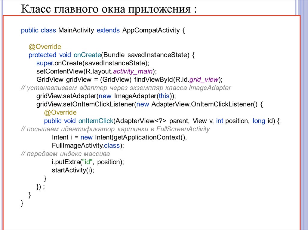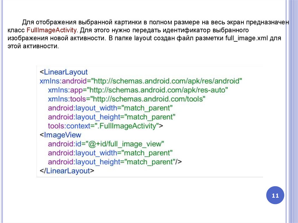 Для отображения выбранной картинки в полном размере на весь экран предназначенкласс FullImageActivity. Для этого нужно передать идентификатор выбранного