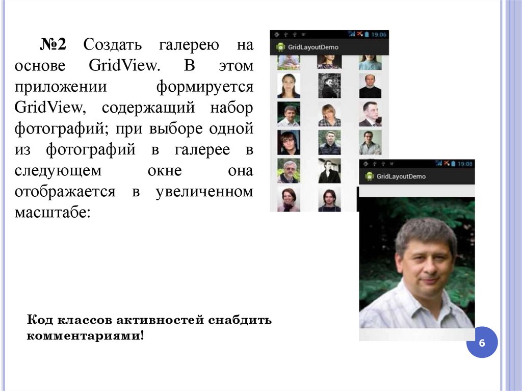 Фотографии (или др. картинки на усмотрение) для галереиразместить в папке res/drawable-hdpi. На главном экране
