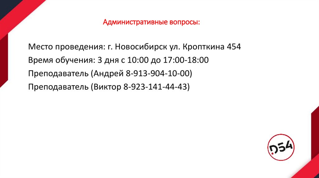 Административные вопросы:Место проведения: г. Новосибирск ул. Кропткина 454