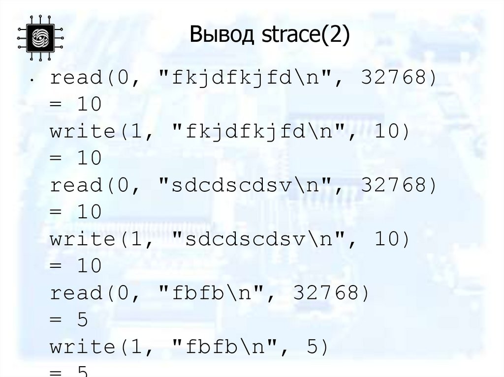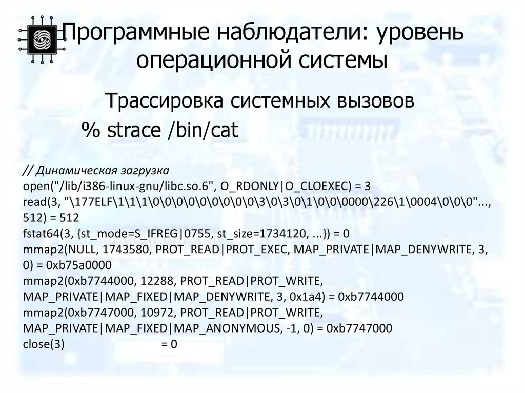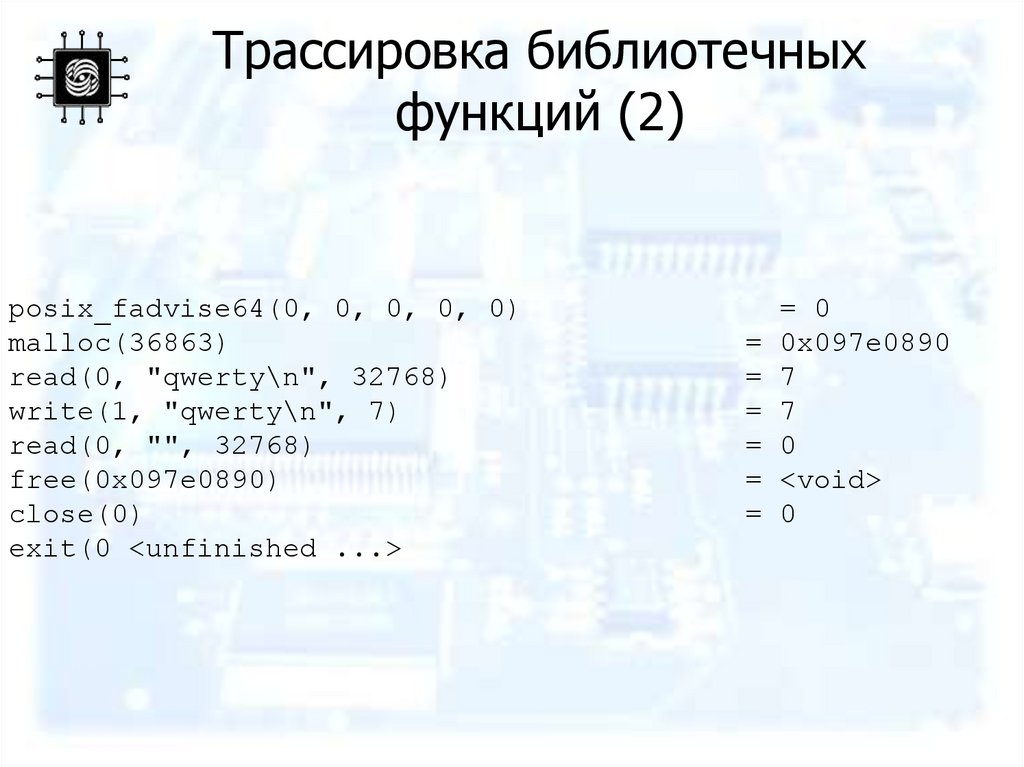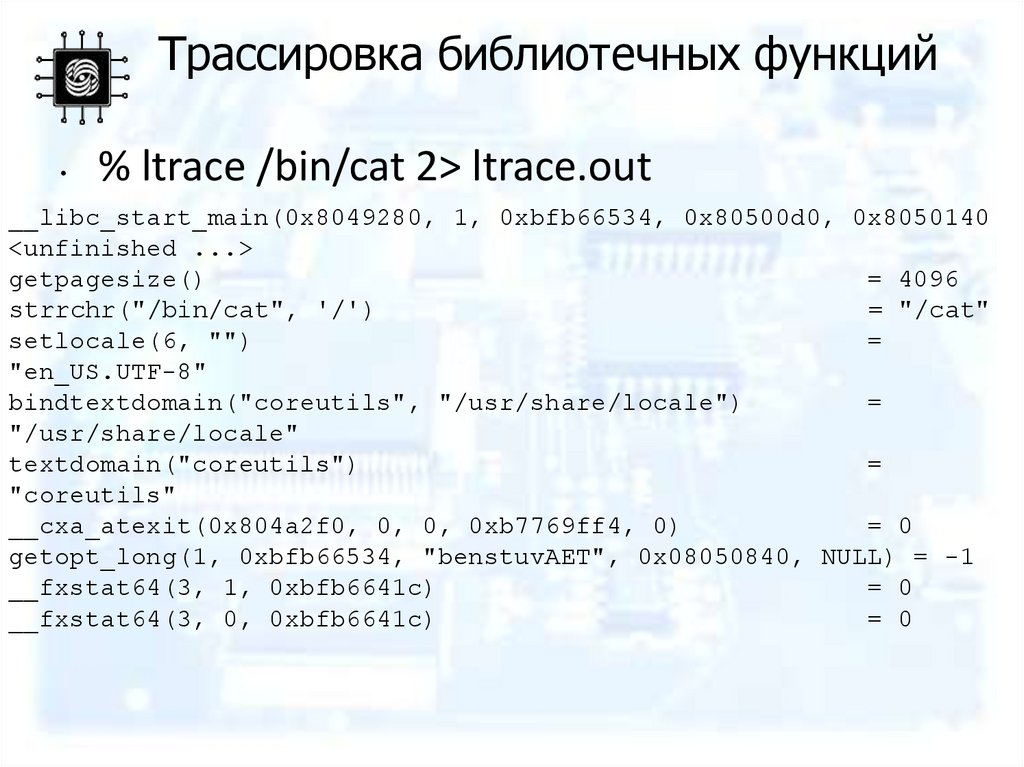 Трассировка библиотечных функций% ltrace /bin/cat 2> ltrace.out