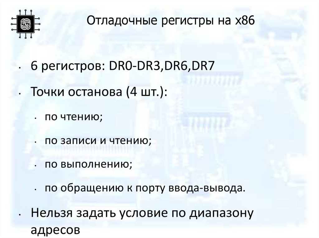 Отладочные регистры на x866 регистров: DR0-DR3,DR6,DR7
