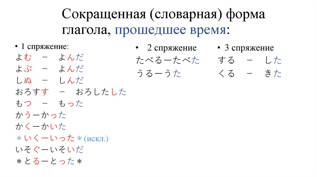Спряжения глаголов: 3 вида1 вид: заканчиваются на む・ぶ・く・う・ぬ・す・つ