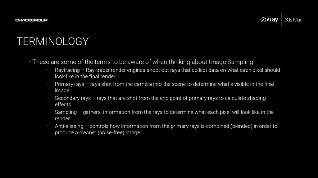 Anti-aliasing – controls how information from the primary rays is combined (blended) in order to