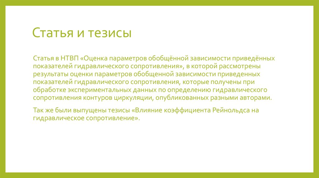 Так же были выпущены тезисы «Влияние коэффициента Рейнольдса на