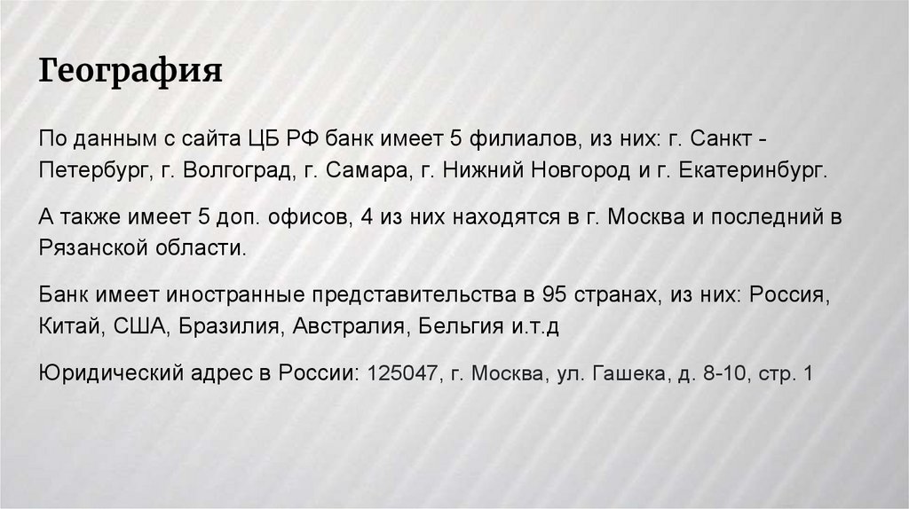 ГеографияПо данным с сайта ЦБ РФ банк имеет 5 филиалов, из них: г. Санкт Петербург, г. Волгоград, г. Самара, г. Нижний Новгород и г. Екатеринбург.