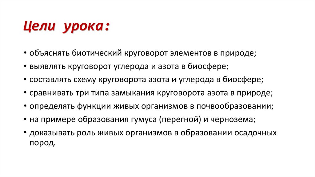 Цели урока:• объяснять биотический круговорот элементов в природе;